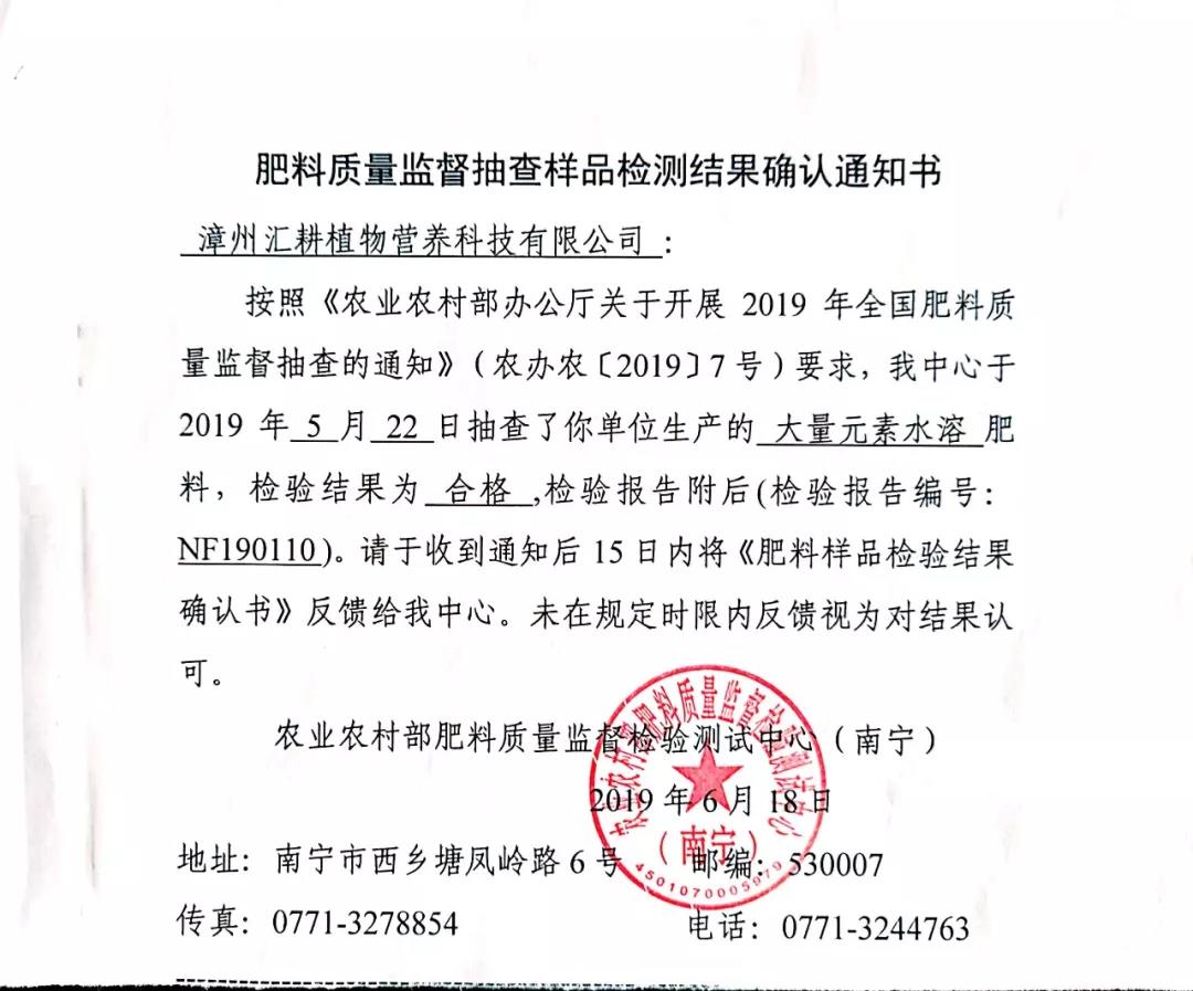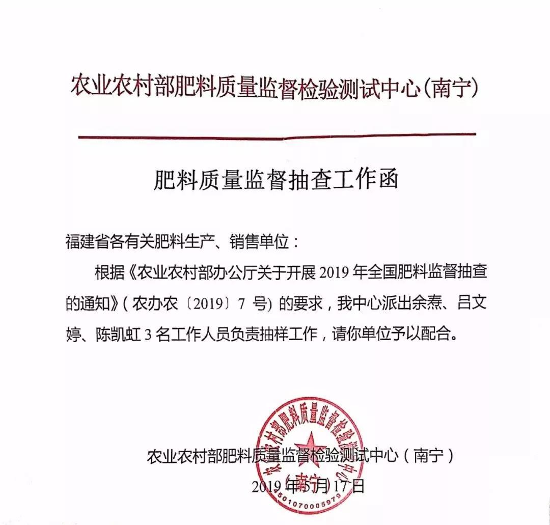 2019年5月22日,農(nóng)業(yè)農(nóng)村部肥料質(zhì)量監(jiān)督檢驗測試中心(南寧)余燾、呂文婷、陳凱虹、省土肥站肥料科付科長、漳州市土肥站丁站長蒞臨“福建三炬”對大量元素水溶肥和有機肥進行現(xiàn)場抽樣,經(jīng)過抽樣檢測均合格。“福建三炬”成立22年以來,一直保證產(chǎn)品的“品正質(zhì)優(yōu)”。