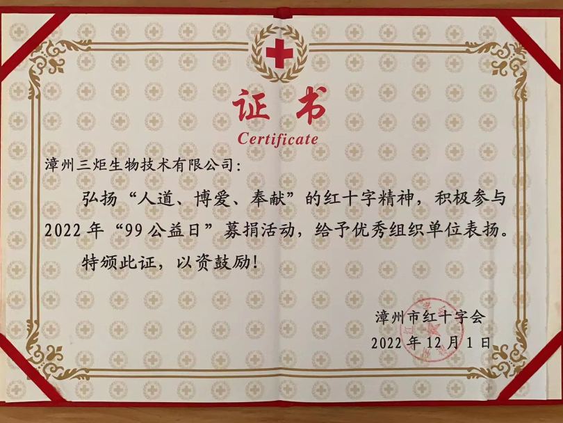 為踐行社會主義核心價值觀,弘揚“人道、博愛、奉獻”的紅十字精神,“三炬生物”積極組織公司員工參與漳州市紅十字會組織的2022年“99公益日”愛心募捐活動并獲得“優(yōu)秀組織單位”。